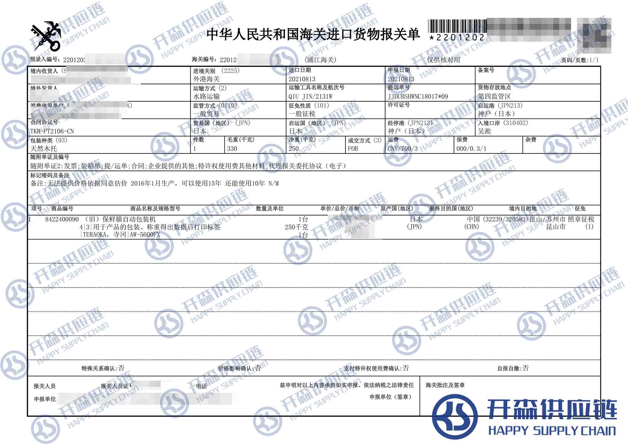 【導讀】您正在閱讀的是關于上海港日本舊保鮮膜自動包裝機進口報關代理【進口案例】的內容,本文由開森二手機械進口報關代理小編整理編寫;