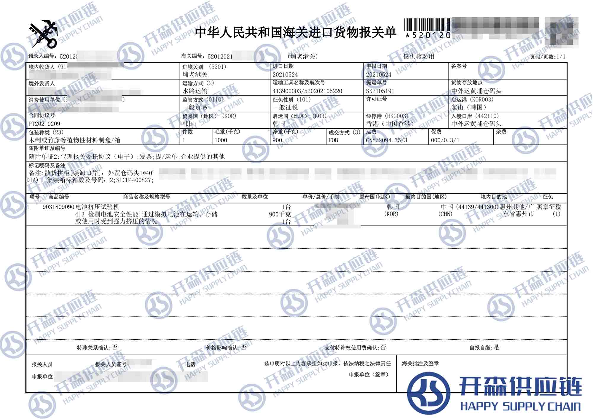 【導讀】您正在閱讀的是關于韓國電池擠壓試驗機進口報關代理服務【進口案例】的內容,本文由開森機械進口報關代理小編整理編寫;