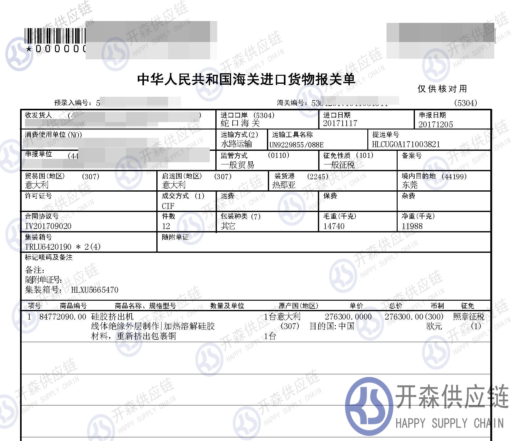 從意大利進口一臺硅膠擠出機到深圳蛇口碼頭,我司提供門到門機械設備進口一站式清關服務,開森擁有十余年二手機械設備進口清關經驗及案例,為客戶提供量身制作的進口方案,讓客戶進口省時省心省成本。